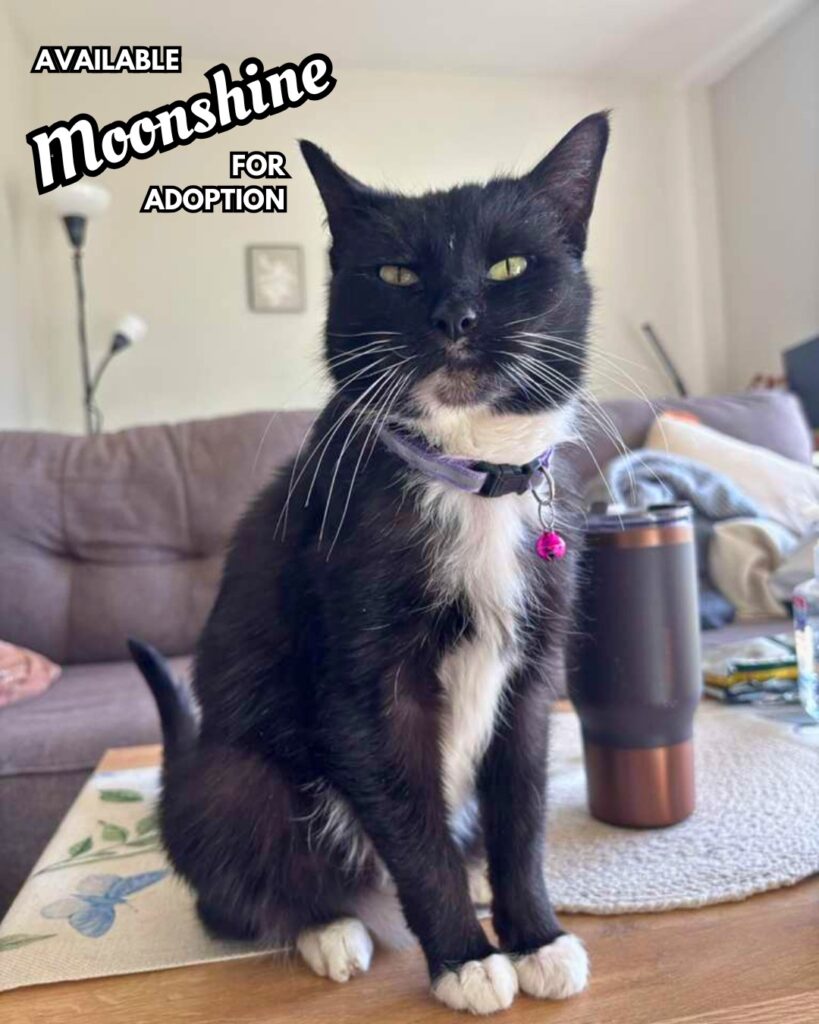 If your life could use a little more calm, a little more closeness, and a tiny tuxedo who believes personal space is optional, Moonshine is ready to center herself right next to you.