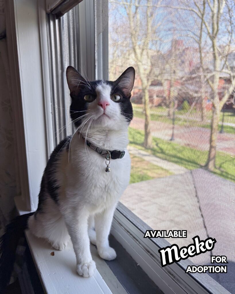 So, if you’re ready for a cat with personality, humor, and a whole lot of love wrapped up in black and white fluff, Meeko is ready to move in and run the place.