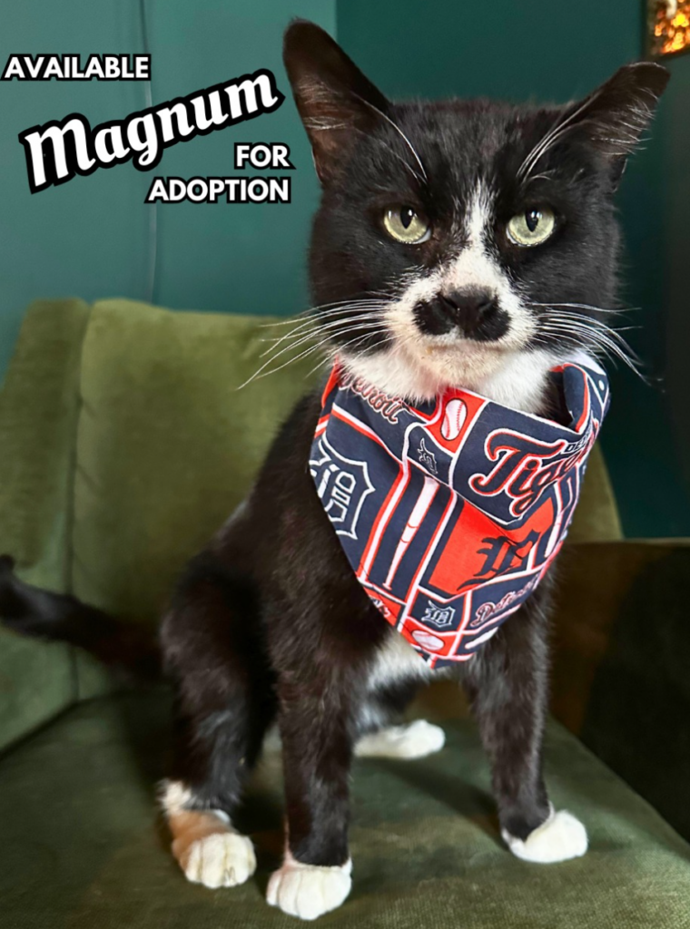 After five long years as a colony cat in Northwest Detroit, Magnum clocked out of outdoor life, handed in his badge, and decided it was time for soft couches, full bowls, and a steady stream of affection. Retirement looks very good on him. Especially with a Detroit Tigers collar, a bandana collection, and that unmistakable mustache that says he has stories to tell.